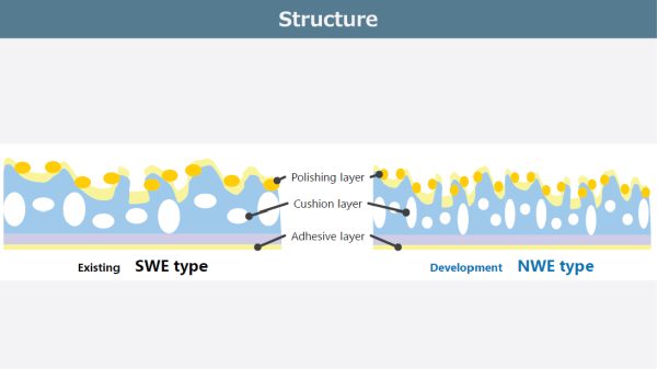 The unique feature of the NWE type is its denser polishing layer, achieved through smaller foam pores compared to the existing SWE type. This characteristic makes it particularly suitable for narrow pin pitch probe cards. As semiconductor devices continue to shrink in size, probe card pin pitches are also becoming narrower. The NWE type is designed specifically to address the needs of narrow pin pitch probe cards.